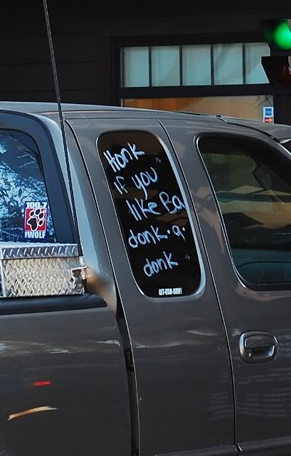 In the line to enter Yellowstone, I saw a strange message scribbled on the side of a pickup truck. I honked, naturally, and received a smile from a fat elderly woman…. very strange.