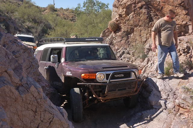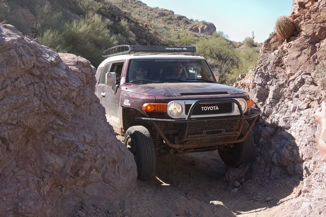 Just for fun and with NO expectation of even remotely being able to get over it, I tried the Up and Over… clearing the front end was a challenge, and once on the wall all that happened was the rear of the frame stuck into the ground. My rear wheels never quite made it onto the rock, there just isn’t enough departure angle on the FJ.